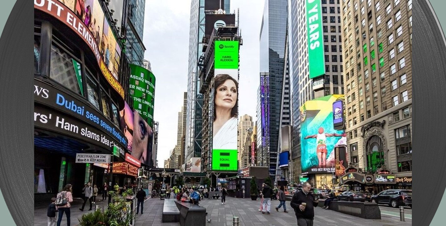 Η Χάρις Αλεξίου, εμφανίστηκε σε billboard στη φημισμένη Times Square της Νέας Υόρκης ως πρέσβειρα Ελλάδας και Κύπρου στην παγκόσμια καμπάνια EQUAL του Spotify με θέμα την ισότητα και την ενδυνάμωση της γυναικείας επιρροής στην μουσική βιομηχανία.