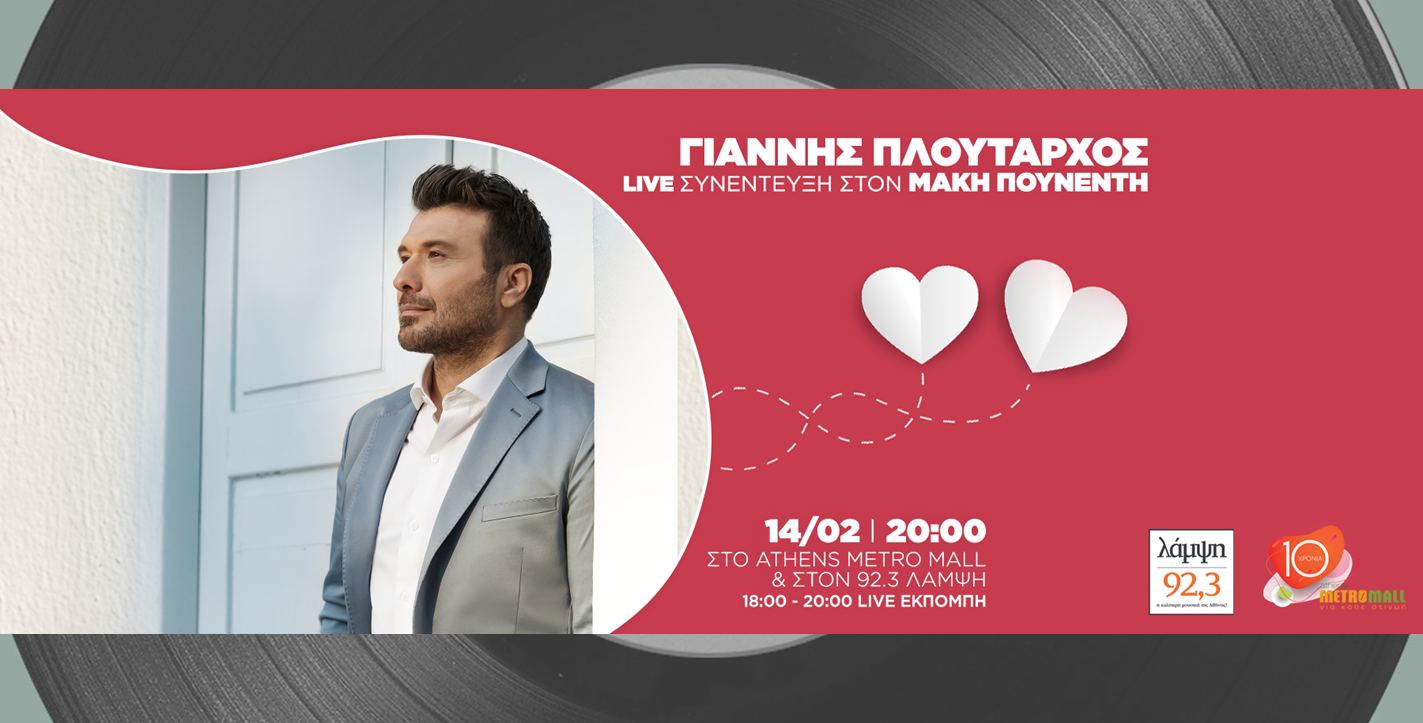 Ο 92.3 Λάμψη θα εκπέμπει ζωντανά από τις 18:00 έως τις 20:00 από το Αthens Metro Mall και αμέσως μετά, μια μοναδική συνέντευξη με τον Γιάννη Πλούταρχο από τον Μάκη Πουνέντη!
