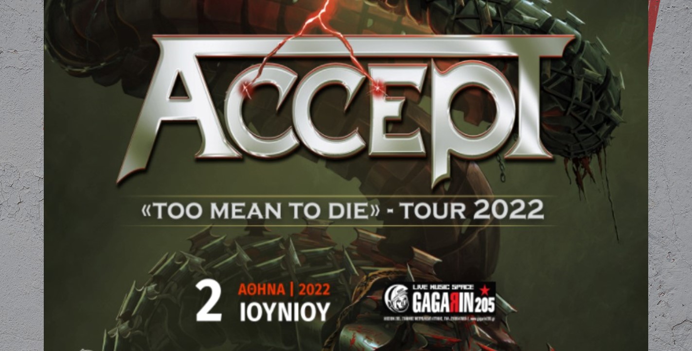 Οι θρυλικοί γερμανοί metallers Accept επιστρέφουν στην Ελλάδα, για να παρουσιάσουν ζωντανά το νέο album τους "Too Mean To Die" και να παίξουν όλα τα classics, την 2 Ιουνίου 2022 στην Αθήνα (Gagarin 205) και στις 3 Ιουνίου 2022 στη Θεσσαλονίκη (Principal Club Theater).