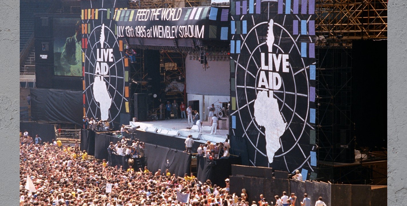Μια από τις πιο εμβληματικές στιγμές της δεκαετίας του '80 υπήρξε το Live Aid, το πνευματικό παιδί των Bob Geldof και Midge Ure, οι οποίοι μετά το "Do They Know It's Christmas?" θέλησαν να συγκεντρώσουν περισσότερα χρήματα για την Αιθιοπία, διοργανώνοντας μια διπλή ιστορική συναυλία με τα μεγαλύτερα μουσικά ονόματα της εποχής σε δύο στάδια εκατέρωθεν του Ατλαντικού. Δεκάδες καλλιτέχνες ανέβηκαν από το πρωί έως το βράδυ στις δύο σκηνές, στο Wembley του Λονδίνου και στο John F. Kennedy της Φιλαδέλφειας, ενώ συγκροτήματα όπως οι Led Zeppelin, οι Crosby, Stills, Nash & Young και οι Black Sabbath επανενώθηκαν ειδικά για την συγκεκριμένη διοργάνωση. Στα highlights της ημέρας ήταν φυσικά η θρυλική εμφάνιση του Freddie Mercury των Queen, ο οποίος βρέθηκε κάποια στιγμή να τραγουδά κυριολεκτικά μαζί με ολόκληρο το Wembley, αλλά και οι εμφανίσεις του Phil Collins και στις δύο ηπείρους, χάρη στις άριστα συντονισμένες πτήσεις ελικοπτέρου και Concorde. Εκτός από τους 90.000 θεατές στις Η.Π.Α. και τους 72.000 στο Ηνωμένο Βασίλειο, η διοργάνωση μεταδόθηκε ζωντανά μέσω μιας φιλόδοξης δορυφορικής μετάδοσης σε ολόκληρο τον κόσμο, φτάνοντας σε ένα κοινό περίπου 2 δισεκατομμυρίων τηλεθεατών σε 150 χώρες.