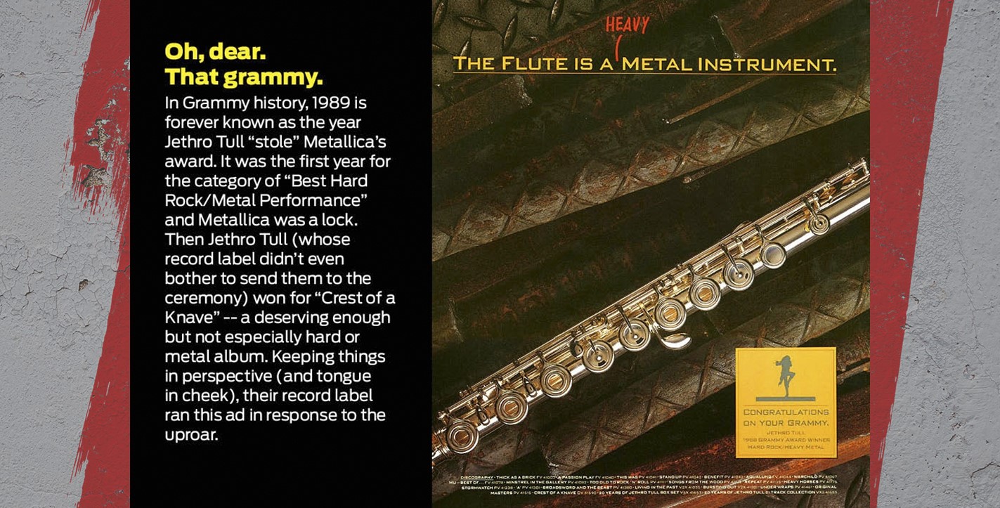 22 Φεβρουαρίου 1989... Σε μια ακατανόητη επιλογή εκ μέρους της Ακαδημίας, οι Jethro Tull κερδίζουν το πρώτο Grammy στην νέα κατηγορία 'Best Hard Rock/Metal Performance' στην οποία φαβορί ήταν οι Metallica.