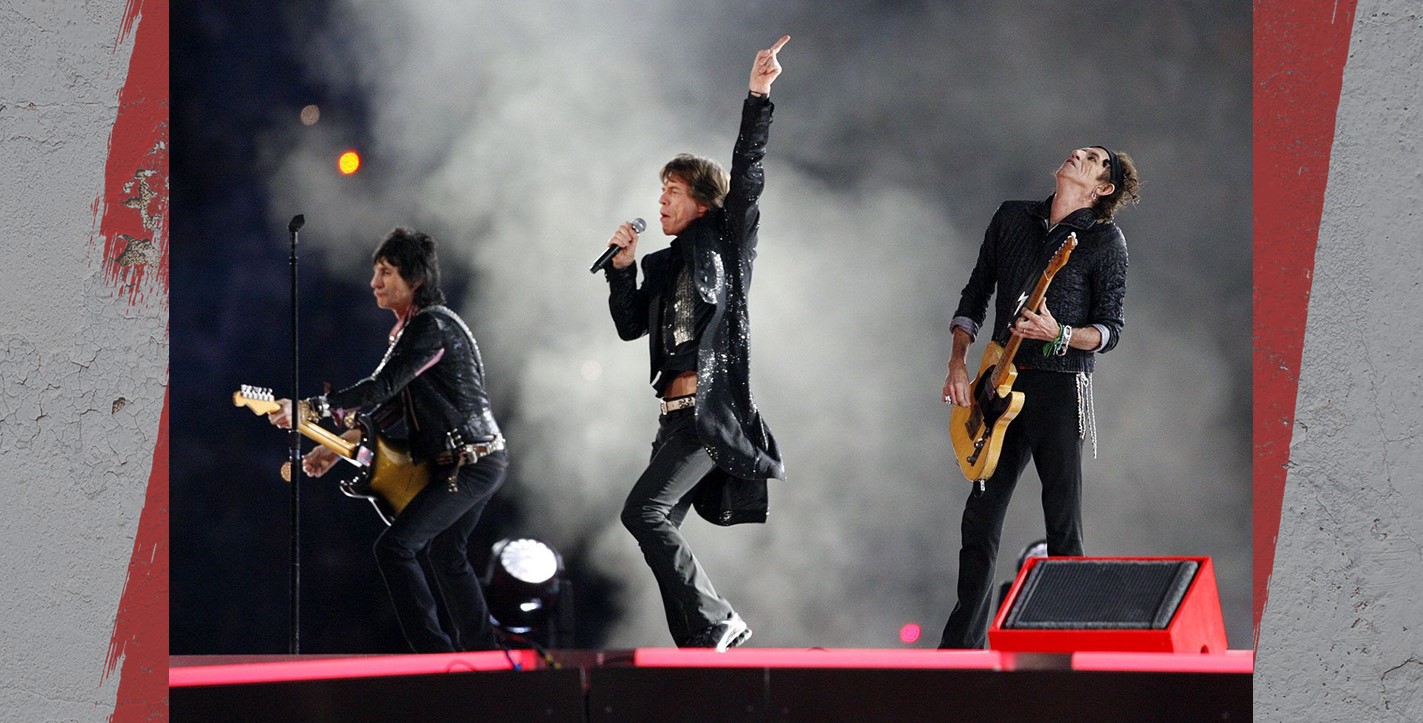 5 Φεβρουαρίου 2006... Σε μια σκηνή στο σχήμα της εμβληματικής γλώσσας του λογοτύπου τους, οι Rolling Stones κάνουν την εμφάνισή τους στο Halftime Show του Super Bowl XL.