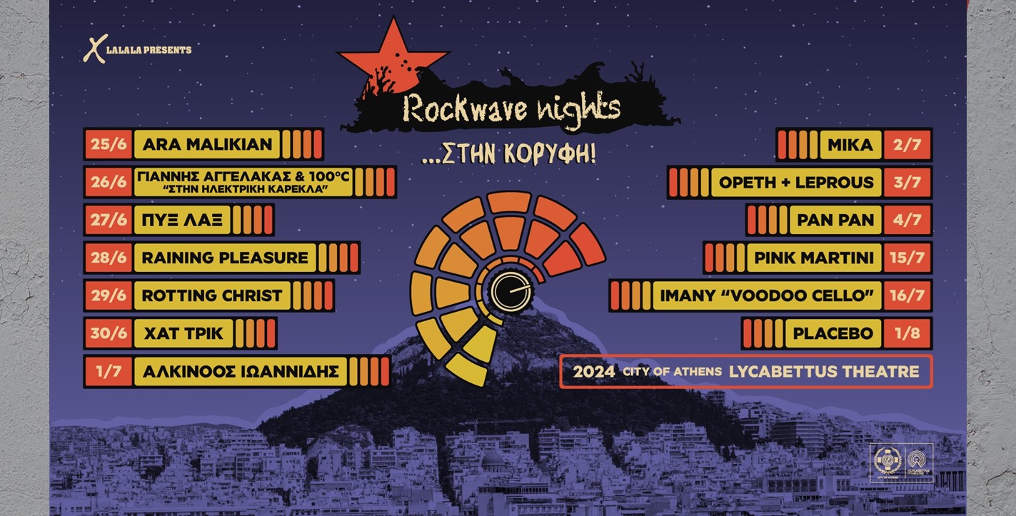 Με Placebo, Opeth, Machine Head, Raining Pleasure, Pink Martini, αλλά και Γιάννη Αγγελάκα & 100°C, Αλκίνοο Ιωαννίδη και ΠΥΞ ΛΑΞ στο lineup, τα Rockwave Nights στήνουν μια μοναδική γιορτή με φόντο τους ανοιχτούς ορίζοντες, στην καρδιά του Αθηναϊκού καλοκαιριού. Μια ηλεκτρική γιορτή μέσα στα δύσκολα της εποχής μας, μια πολύτιμη μοιρασιά ψυχής που όλοι χρειαζόμαστε.